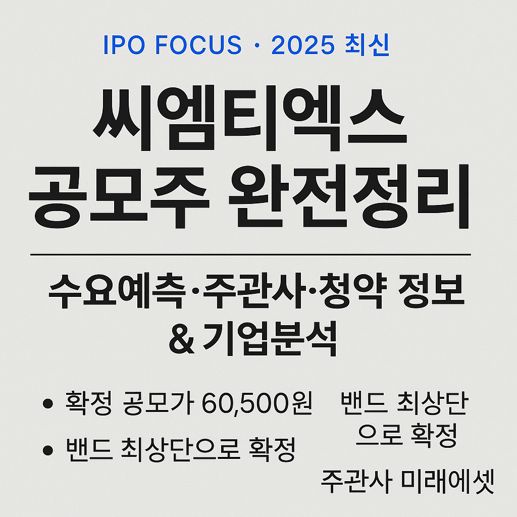 2025년 11월 상장을 앞둔 씨엠티엑스(CMTX)는 올해 공모주 시장의 주목받는 반도체 소재 기업 중 하나입니다. 공모가 밴드는 51,000원~60,500원으로 제시되었으며, 주관사는 미래에셋증권입니다. 수요예측은 11월 10일부터 11일까지 진행되며, 일반 투자자 대상 청약은 11월 20일로 예정되어 있습니다. 본 글에서는 씨엠티엑스의 기업 개요부터 수요예측 결과 전망, 공모가 확정 과정, 상장 후 주가 흐름 가능성까지 자세히 정리합니다.