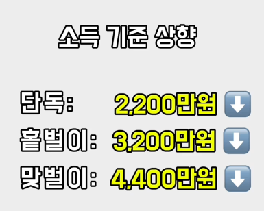 - 홑벌이가구: 배우자 소득 300만 원 미만 또는 부양자녀·직계존속이 있는 가구 → 총소득 3,200만 원 미만